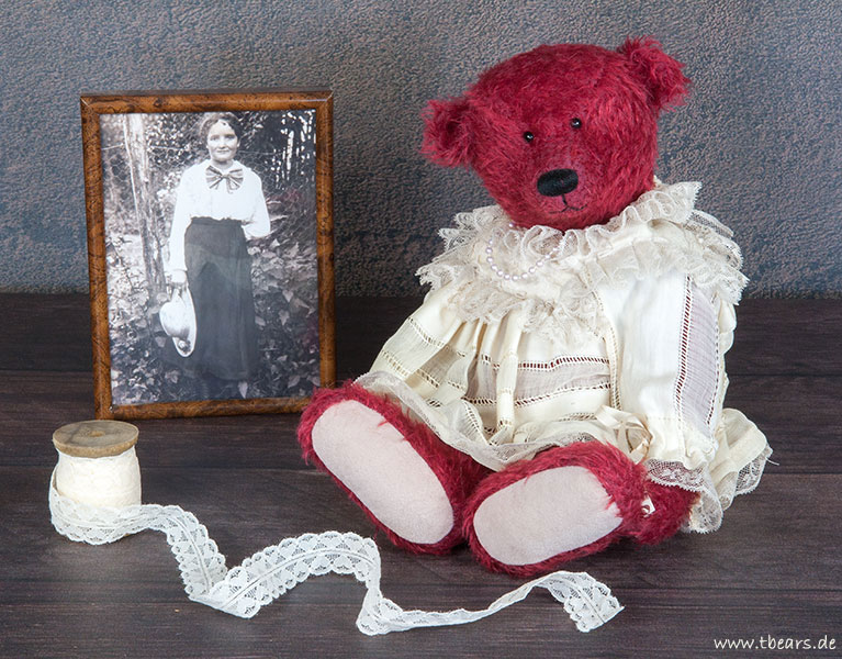 Rosi ist ein 34 cm großer traditioneller Teddybär. Sie wurde aus antikem Sparse Mohair genäht. Rosi hat schwarze Glasaugen und ist mit Schafwolle und Granulat gefüllt. Ihre Gelenke sind relativ locker wie bei alten Bären. Rosi trägt ein romantische Spitzenkleid. Sie ist wie fast alle meiner Bären ein Unikat.